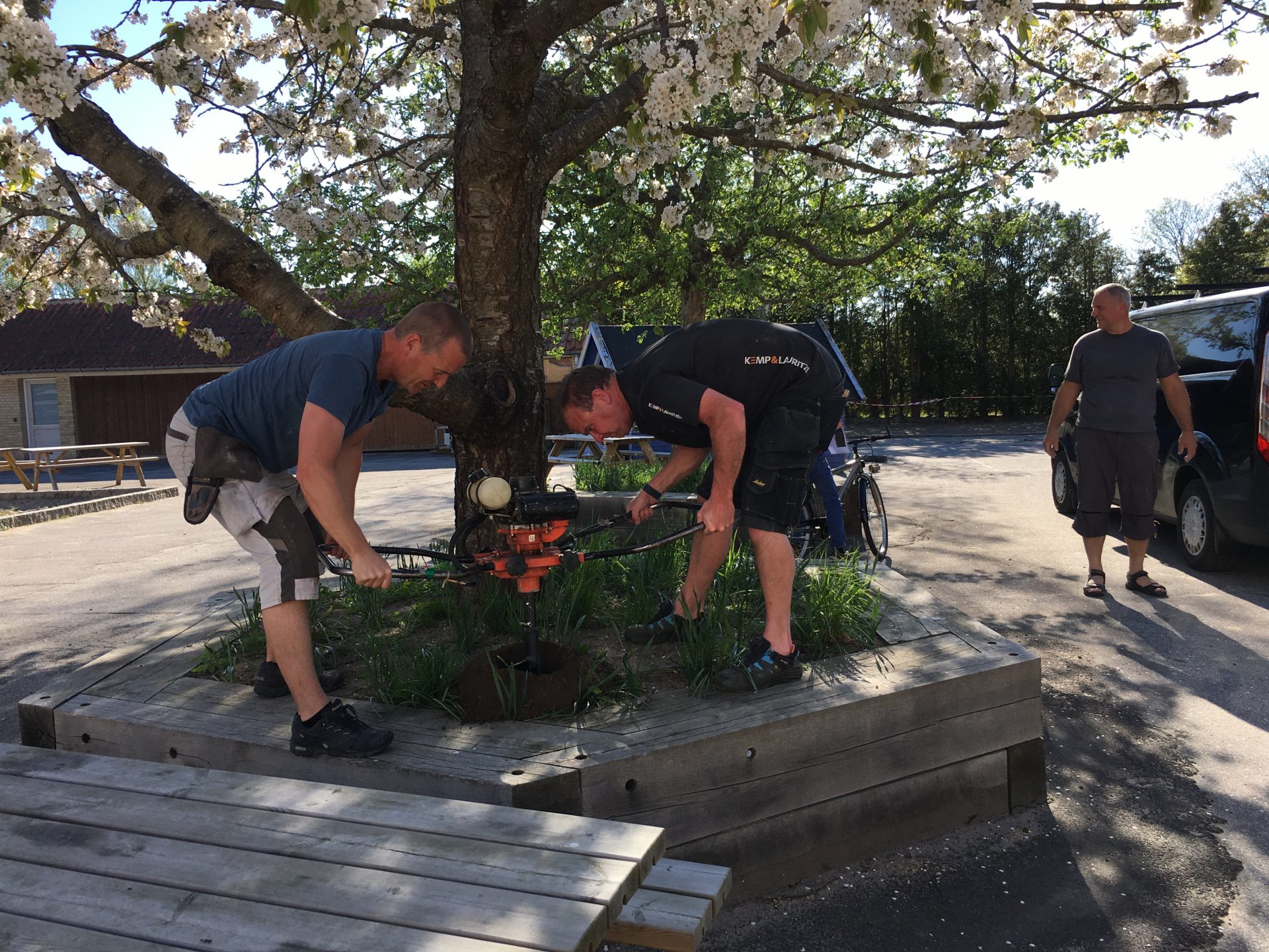 Forrige billedeniende pæl ved den gamle skole Den 9. pæl gav problemer, da gården er fyldt med asfalt længere nede. Løsningen var et højbed!